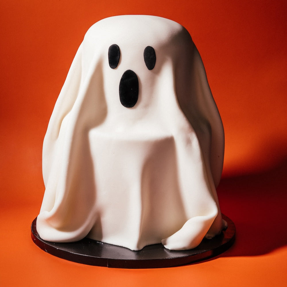 A spooky yet delicious chocolate cake with creamy frosting, ghostly decorations, and rich, moist layers, perfect for 30 guests.