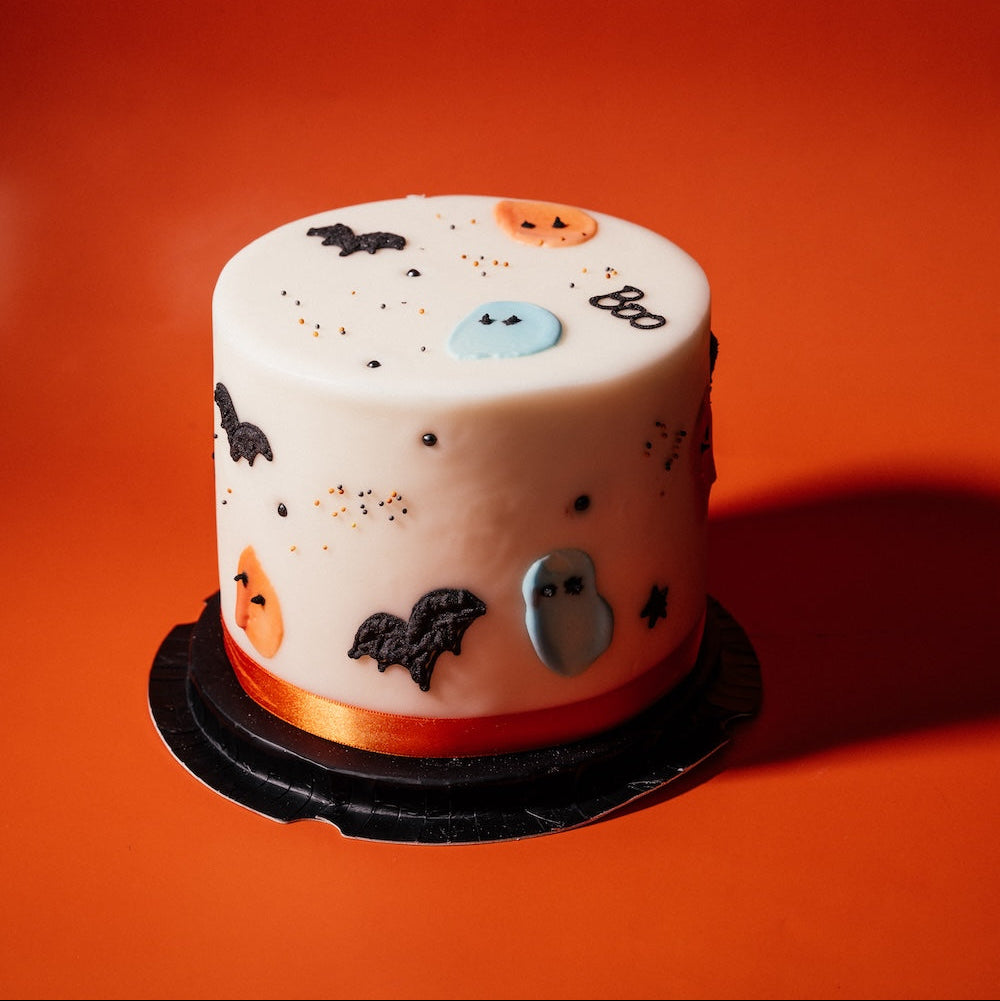 A spooky Halloween chocolate cake with ghostly, bat, and “Boo!” decorations, moist chocolate layers, and creamy frosting