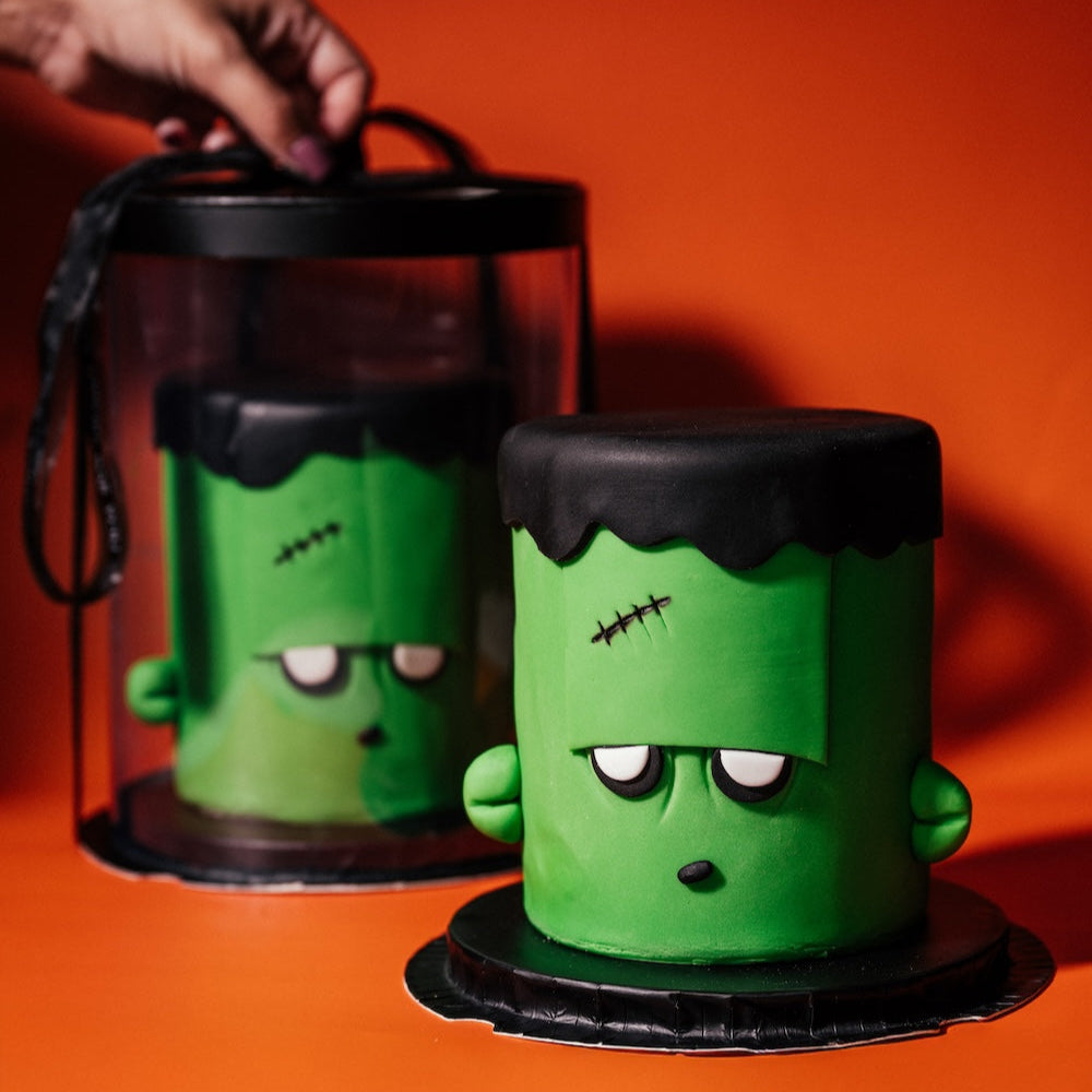 A spooky-fun green cake with chocolate “stitches” and quirky monster details, featuring rich, moist chocolate layers and creamy chocolate frosting inside.