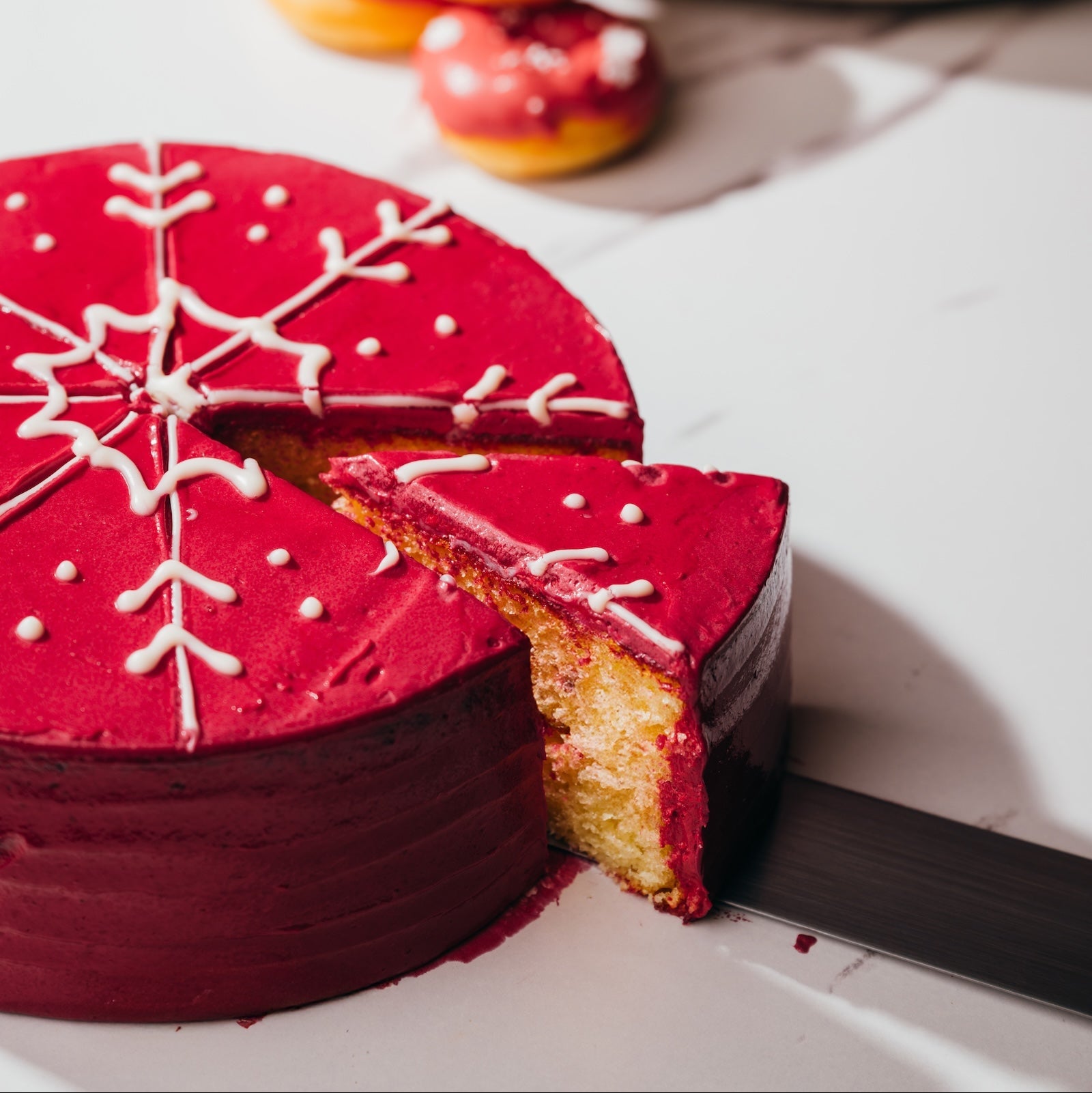 Our Snowflake Winter Cake features layers of spiced vanilla sponge infused with festive fruit mince and wrapped in smooth cinnamon buttercream. Elegantly finished in rich red buttercream and adorned with delicate white chocolate snowflakes, it’s a warm, nostalgic taste of Christmas
