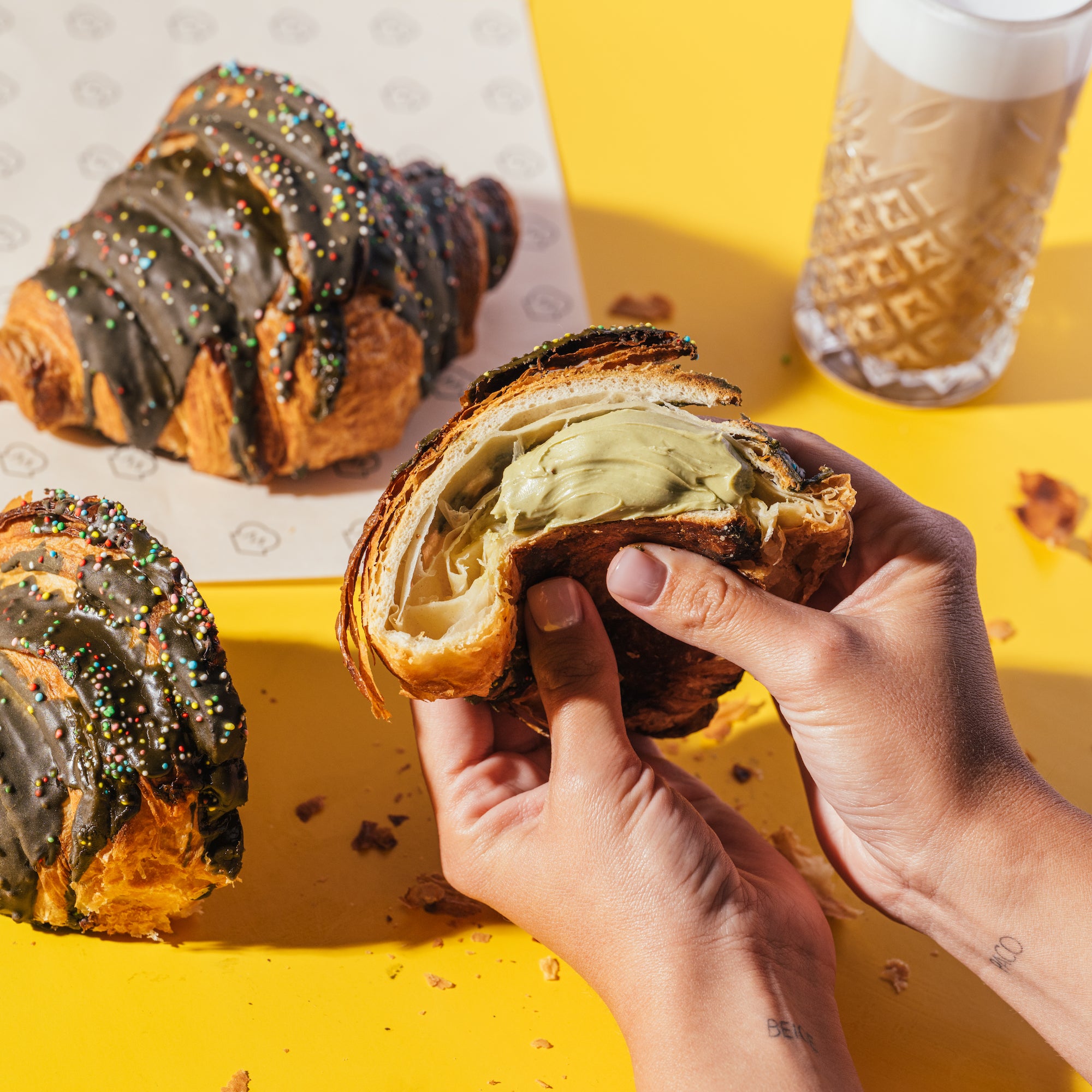 Pistachio Figollini Croissant - A large flaky croissant coated with fondant icing and topped with coloured sprinkles.